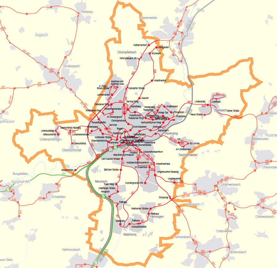 Wenn die im Plan eingezeichnete orange Linie (Zone 1) überfahren wird, muss die Reststrecke bezahlt werden. Die Zone Backnang wir dabei dem Preis entnommen; somit wird das Fahrticket um eine Zone vergünstigt. Fahrpläne für S-Bahnen, Nachtbusse und Regionalbahnen gibt es unter www.vvs.de.